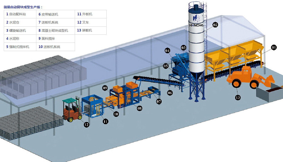 简易生产线流程:将不同的骨料放入配料站,自动配比称重,然后与水泥仓的水泥混合。所有材料随后被送至搅拌机。在混合均匀后,皮带输送机将物料输送到砌块成型机。振动加压后成型的制品经砖面清扫器清扫后转移到升板机。然后由叉车或者2名工人将制品送到场地上自然养护。