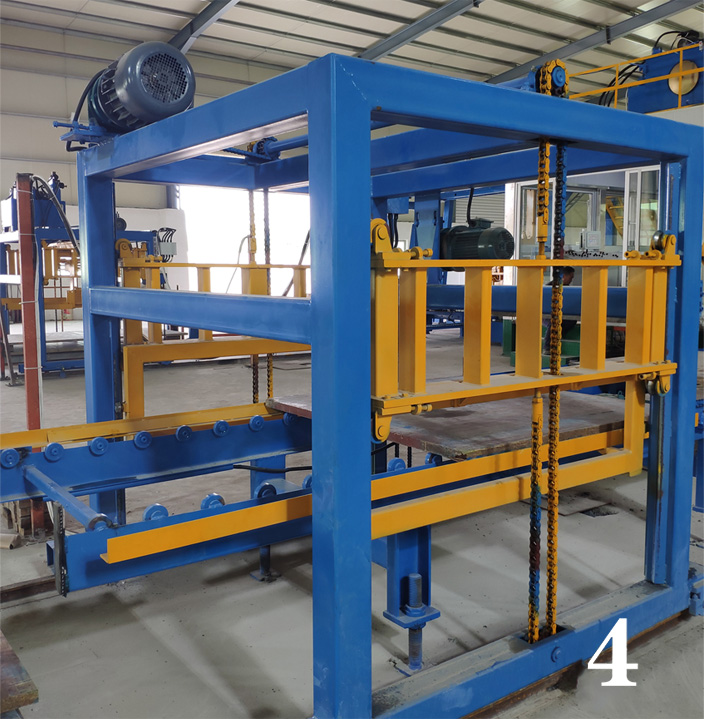 降板机用于将养护好的制品送到送砖机,随后进入码垛区码垛。托板由回板系统送回成型机循环使用。