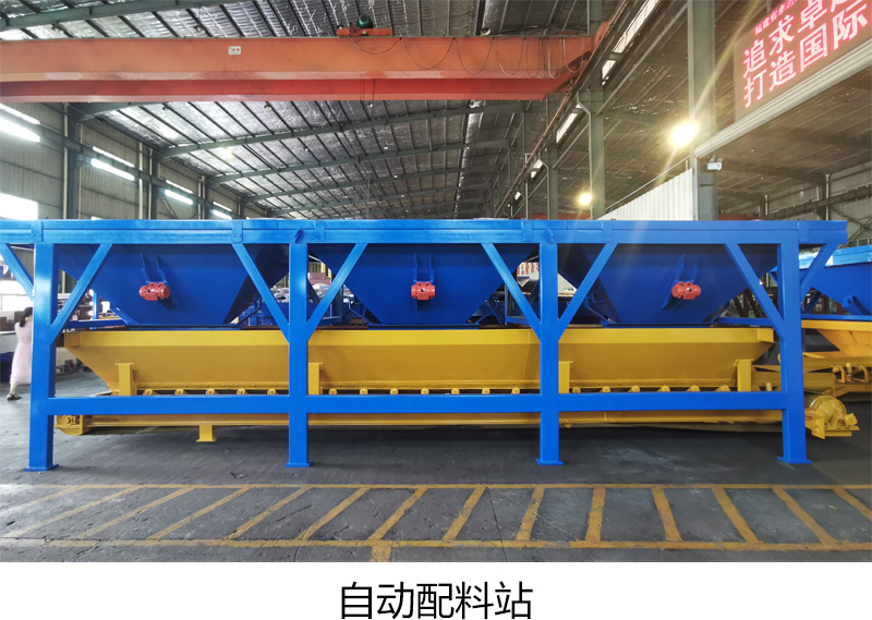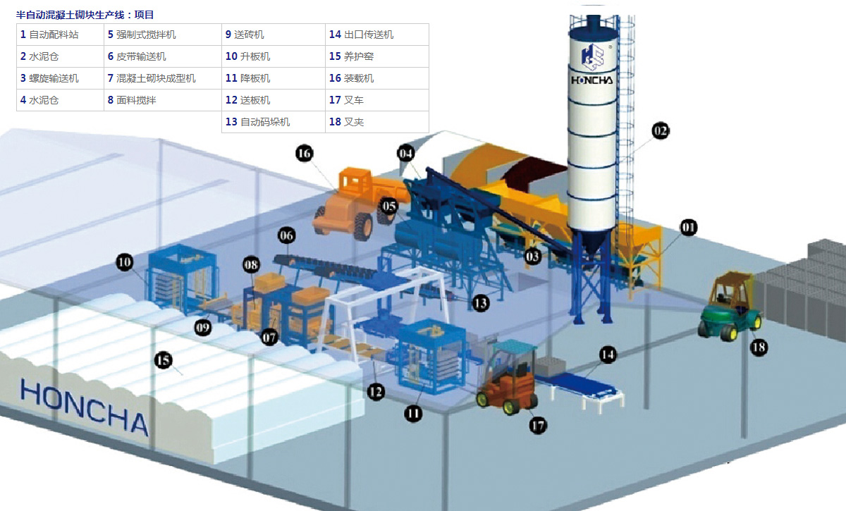 半自动生产线流程:装载机将不同的骨料放入配料站,自动配比称重,然后与水泥仓的水泥混合。所有材料随后被送至搅拌机。在混合均匀后,皮带输送机将物料输送到砌块成型机。振动加压后成型的制品经砖面清扫器清扫后转移到升板机。然后,叉车将所有托板上的制品送到养护室进行养护。已养护好的制品再由叉车送到自动降板机。降板机将制品降至送砖机后进入码垛区码垛,然后由叉车运至成品堆场销售。托板经清扫器清扫,翻板机翻板后送回成型机循环使用。