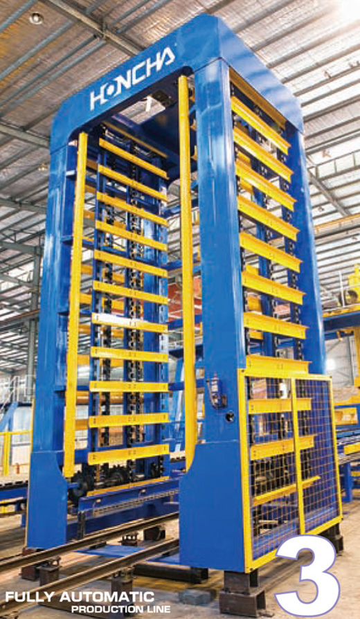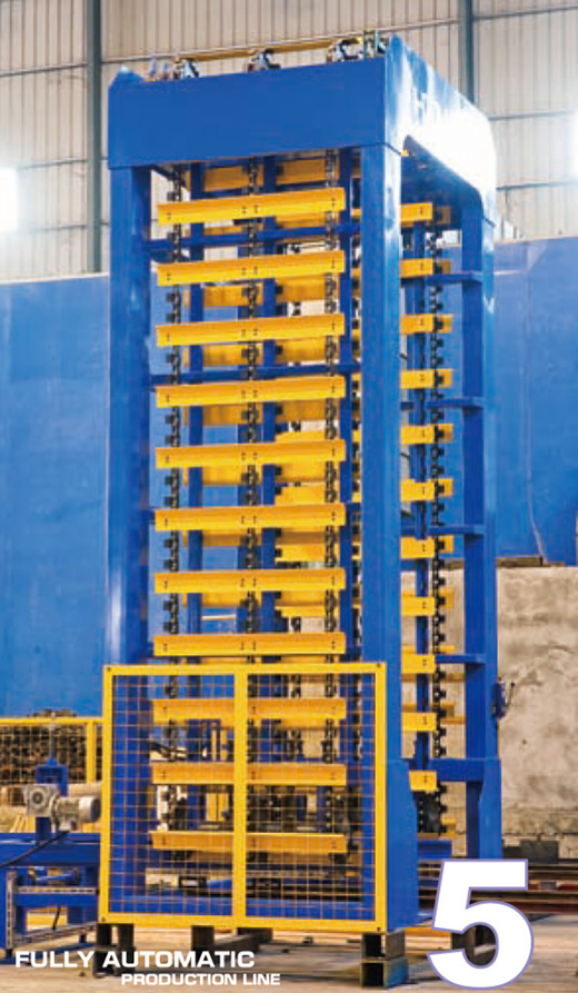 制品经由砖面清扫器后输送至升板机,升板机为全自动养护系统的一部分,可将制品分层并提升到一定高度以配合子母车运作。